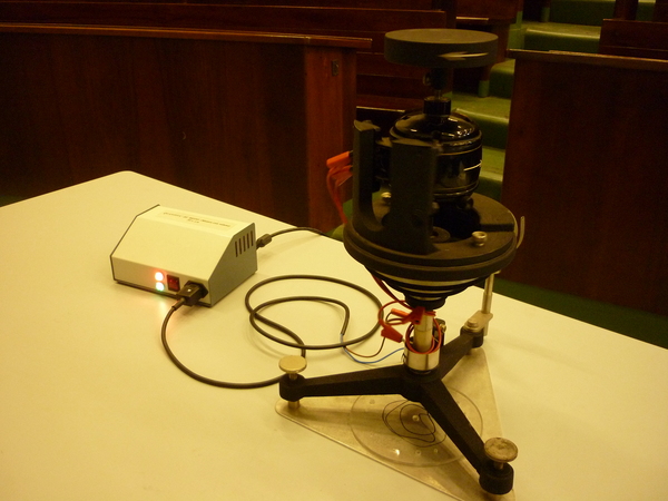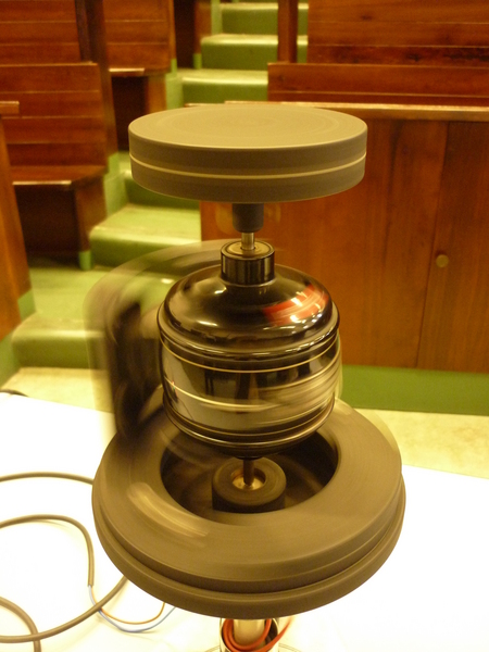 Il sistema è costituito da due volani di massa diversa che possono ruotare attorno al medesimo asse. Il volano di massa maggiore è collegato allo statore di un motore elettrico, mentre quello di massa minore è collegato al rotore del motore. Si accende il motore e si osserva cosa succede.