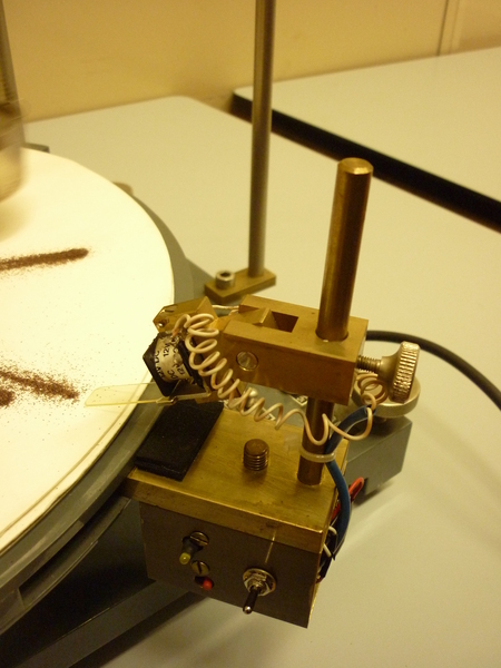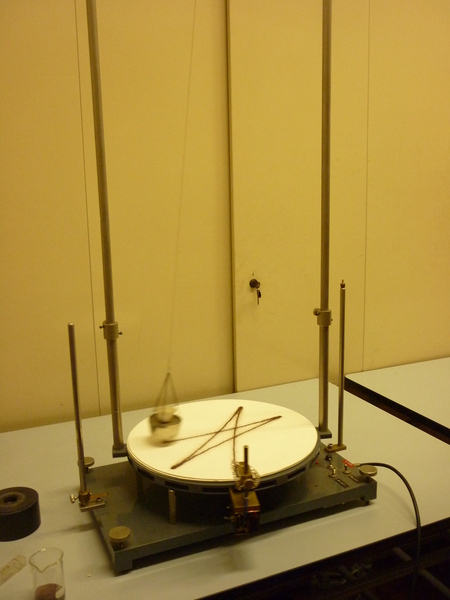 Un pendolo viene montato su una piattaforma rotante che rappresenta il movimento terrestre. All'estremità del pendolo è montato un imbuto contenente della sabbia. Il pendolo viene attaccato a un'elettrocalamita e la piattaforma viene messa in rotazione. Il pendolo viene sganciato mediante un interruttore posto sul bordo della piattaforma e inizia a oscillare lasciando delle tracce di sabbia sulla piattaforma.
