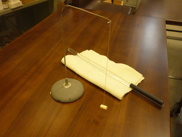 Si strofina con un panno di lana una bacchetta di plexiglas e la si avvicina a una pallina di midollo di sambuco sospesa con un filo isolante, osservando cosa succede.