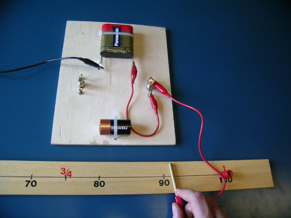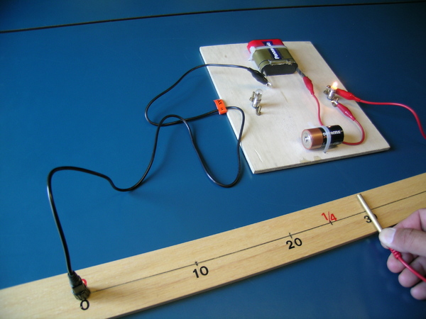1. Collegare in serie, tramite i cavetti, una batteria, una lampadina e il filo a lunghezza variabile (nikel-cromo). Chiudere il circuito tra la batteria e il filo tramite il cavetto con il cilindro di ottone. Posizionare il cilindretto a diverse lunghezze del filo, variandone quindi la porzione percorsa da corrente. Osservare come l'intesità luminosa della lampadina diminuisce all'aumentare della lunghezza del filo.