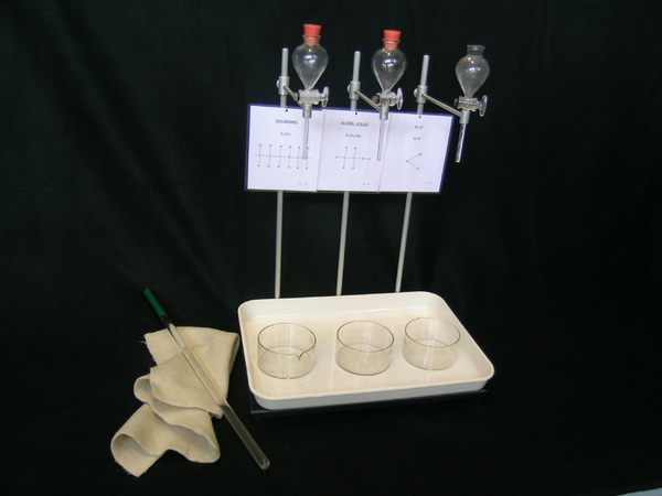 Si posizionano sopra una bacinella tre burette riempite rispettivamente di acqua, alcool etilico e cicloesano, chiuse alla base. Si carica per strofinio una bacchetta e si aprono una alla volta le burette. Si osserva cosa accade al liquido che fuoriesce quando vi si avvicina la bacchetta carica.