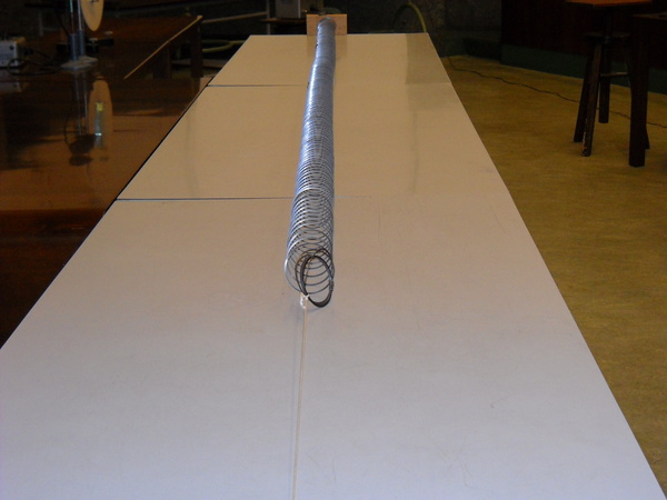 Una molla Slinky, posta sopra un tavolo, viene fissata a un’estremità e dall’altra parte viene allungata tramite un filo. La si fa oscillare lateralmente con la mano prima all’estremità mobile (collegata al filo) e poi a quella fissa. Infine, la molla viene compressa e lasciata andare di colpo. In tutti e tre i casi si osserva la propagazione della perturbazione nella molla.