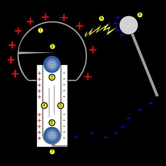 Si osserva che avvicinando una piccola sfera conduttrice collegata a terra alla sfera in tensione, si generano fra le due sfere delle scariche elettriche analoghe ai fulmini che si vedono nell’atmosfera. Con questa macchina, infatti, si possono ottenere tensioni fino a qualche milione di Volt.