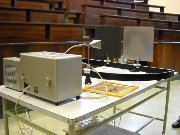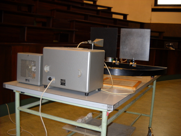 Sulla parte curva di un supporto semicircolare, viene posizionato un diodo ricevitore e, di fronte, sul diametro del supporto, vengono posti due schermi metallici, uno vicino all’altro, davanti a un diodo emettitore. Si analizzano con il ricevitore le caratteristiche dell’onda emessa dal diodo e difratta dalla fenditura tra i due schermi. In un secondo tempo, si realizza con un terzo schermo una doppia fenditura e si studiano anche in questo caso le caratteristiche del segnale trasmesso.