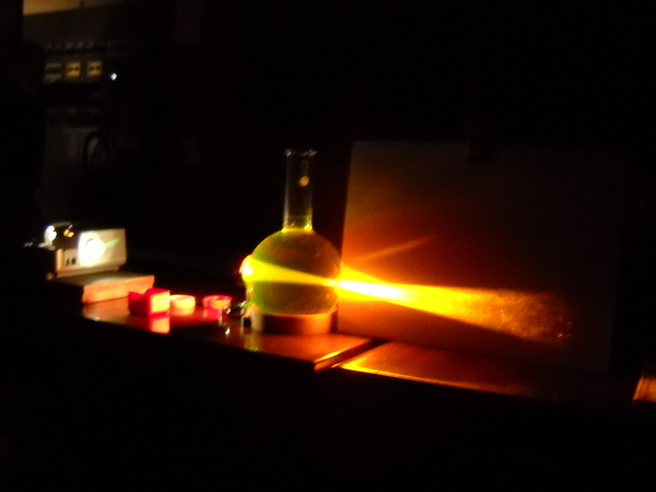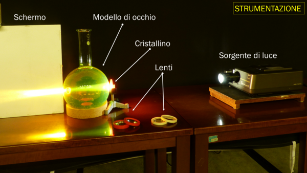 Si posiziona tra un proiettore di luce bianca e uno schermo un'ampolla di forma sferica, riempita di acqua e fluoresceina, che simula il comportamento del bulbo oculare. Si fa entrare un fascio di luce nell'ampolla e si osserva dove il fascio viene focalizzato. Si posiziona poi davanti all'ampolla una lente convergente, che simula un cristallino con il difetto ottico della miopia, e si osserva cosa succede al fascio di luce. Si inserisce poi davanti alla lente convergente, una lente divergente che simula l’effetto correttivo degli occhiali. Infine si procede in modo analogo per studiare il difetto ottico dell'ipermetropia, utilizzando prima una lente divergente per simulare il comportamento del cristallino e aggiungendo poi una lente convergente per rappresentare lo strumento correttivo.