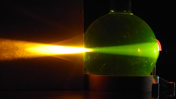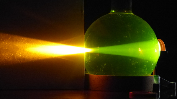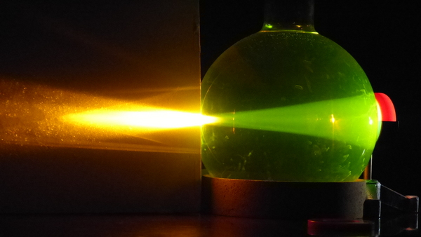 Un’ampolla di forma sferica, riempita di acqua e fluoresceina, viene utilizzata per mostrare i più comuni difetti dell’occhio.